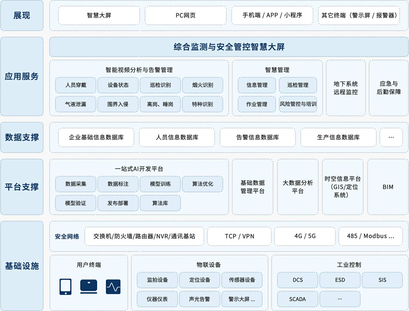 针对矿山安全生产的管理要求,紧抓需求痛点,星空体育·星空网站在线官网入口-星空(中国)创新提出“一基础、双支撑、多平台、N应用”的智慧矿山方案,实现不同阶段需求逐步实现未来智慧矿山。星空体育·星空网站在线官网入口-星空(中国)创新充分利用人工智能算法优势,从智能视频分析风险隐患切入,实现风险隐患全生命周期分析与管理,同时应用智慧化作业流程、智慧检维修提升作业生产效率,应急与后勤保障是重中之重,除了实现地下通风系统、定位系统、电力系统、通讯系统、排水系统以及环境监测系统的全天候监控之外,应急物资管理系统保障物资及时可用,人员设备定位系统保障下井人员位置的实时管控,充分实现应急后勤保障,星空体育·星空网站在线官网入口-星空(中国)创新智慧矿山方案永远将安全生产放在第一位。